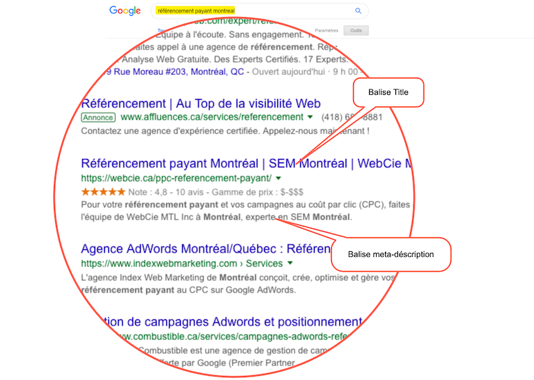 C’est souvent la méta-description qui va inciter l’internaute à cliquer car elle décrit, sous l’URL et le titre, ce que contient la page.