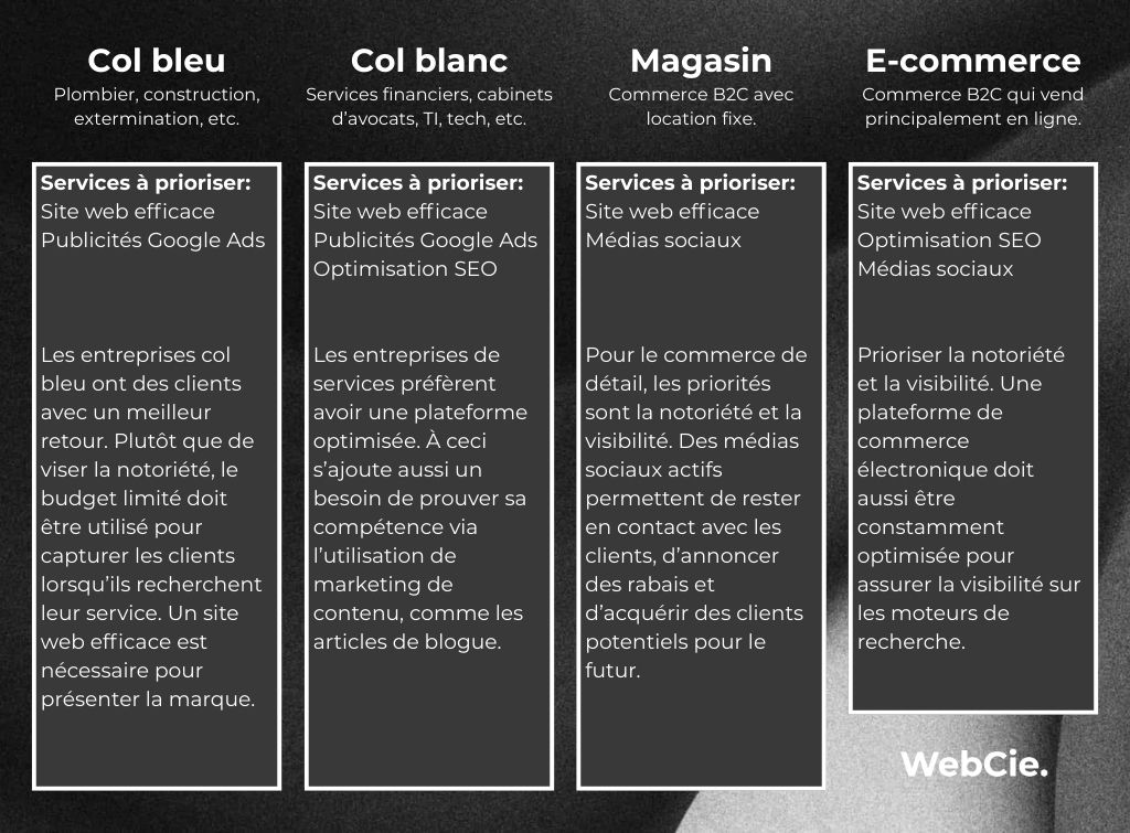 Les entreprises de services col bleu, comme les mécaniciens, garagistes, plombiers, entrepreneurs généraux, sont typiquement mieux servis en investissement, principalement dans leurs sites web et en publicités Google Ads.