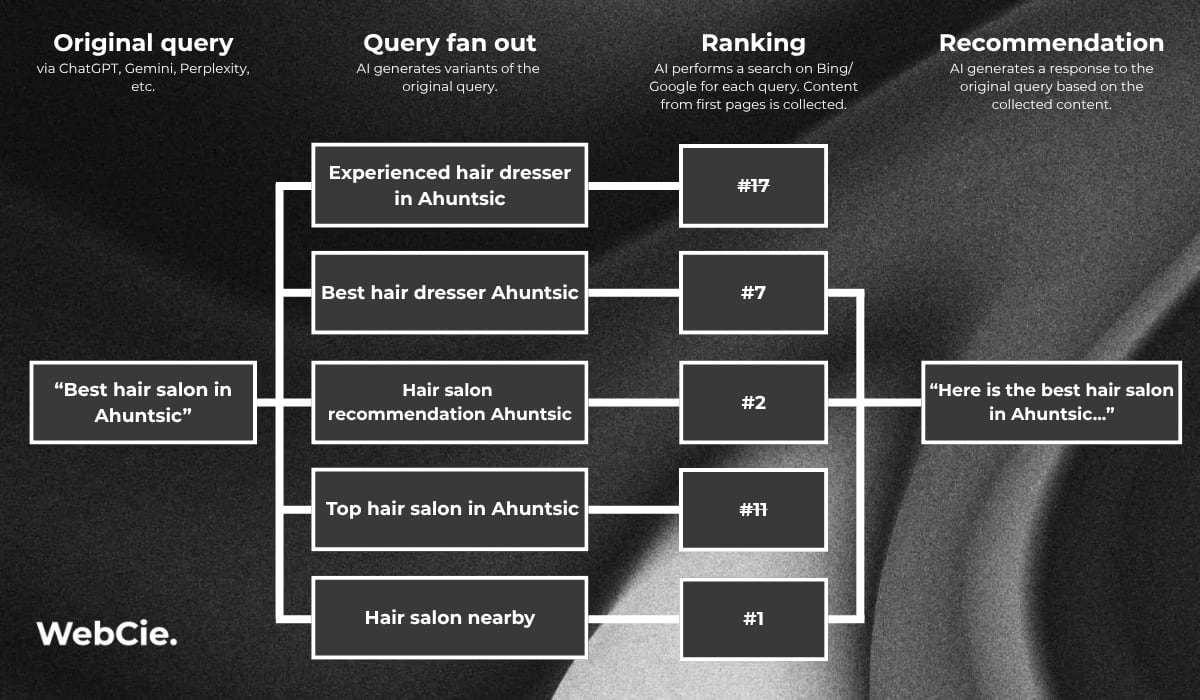 This synthesis process happens every time, but does not always cause a query fan out. In Google AI Mode and Gemini, questions like “what is the best hair salon in my neighbourhood” lead to a visible query fan out. However, a simple query like “hair salon Ahuntsic” in Gemini or ChatGPT does not necessarily provoke a full query fan out. The AI model will still generate an answer based on around ten web pages, which are typically the same ones that appear in Google.